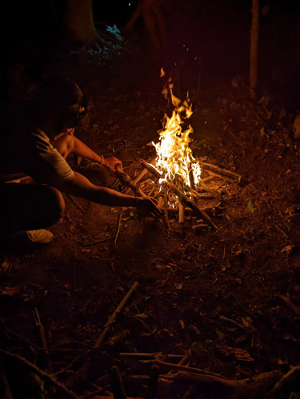 Nachdem der Lageraufbau fertig war, der Schlafsack ausgerollt und das Feuer entzündet, saßen wir alle gemeinsam am Feuern, aßen was wir mitgebracht hatten (ähm so tolles hab ich nicht mitgebracht, aber hey, es muss effizient sein für mich, muss es ja auch schleppen). Hailey hat an der Stelle gefühlt übertrieben - sie hatte einen ganzen Grillrost dabei und aß mindestens 5 Hotdogs an dem Abend. Nach einer geselligen Runde, löschten wir das Feuer und gingen alle zu unseren Zelten. Mit den Nordlichtern war es leider nichts, waren zu tief im Wald um überhaupt etwas vom Himmel zu sehen.