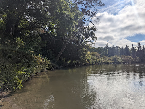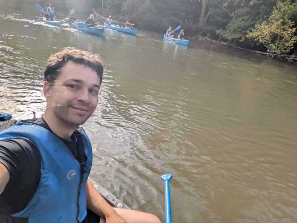 Der Fluss war generell relativ strömungsstark, was uns zu gute kam, da wir nicht so viel paddeln mussten (auch wenn ich das echt cool gefunden hab mit Vollgas den Fluss runterzujagen, aber wurde da oft ausgebremst weil wir zusammenwarten sollten). Wir kamen dann relativ bald zu unserer ersten Kenterung - ein Boot hatte sich relativ brutal in Totholz verfangen und anscheinend konnten sie sich nicht selbst befreien und haben so große Teile ihrer Ausrüstung nass gemacht und ein Paddel verloren. Dante und ich, als erste am Unfallort, wollten helfen, aber wurden gleich darauf angesetzt das Paddel zu holen, was wir dann auch knapp 300m später schafften (es ist echt nicht so einfach das rauszufischen, wenn eine starke Strömung ist und das Kanu schwer lenkbar ist). Wir warteten um das Paddel zurückzugeben, es vergingen sicher 15 Minuten (Beef Jerky ist ein Super Snack für zwischendurch), alle anderen waren bereits an uns vorbei und Dante machte sich auf die Suche nach dem gekenterten Boot und der Rettungsmannschaft. Einige Minuten später waren dann alle wieder da, wir gaben das Paddel zurück und machten uns gemeinsam auf den Weg. Das war eines der wenigen Male wo ich Schlusslicht war (obwohl ich das in Theorie gar nicht sein durfte, weil sie ja eigentlich aufpassen müssen).