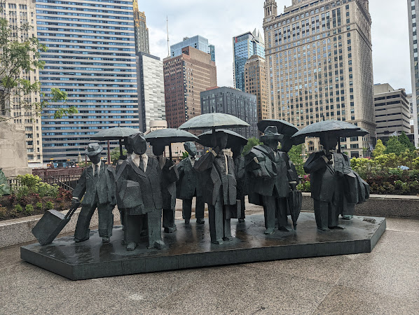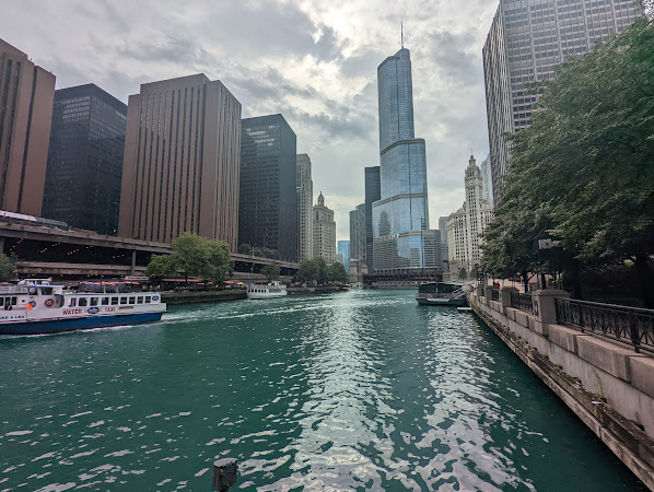 Der Ausblick war okay, andere Plätze haben mir noch immer besser gefallen, aber es war wieder mal was anderes. Dann ging es durch die Stadt zurück zur Riverside und an der entlang. Am Chicago Tribune und diversen Statuen vorbei.