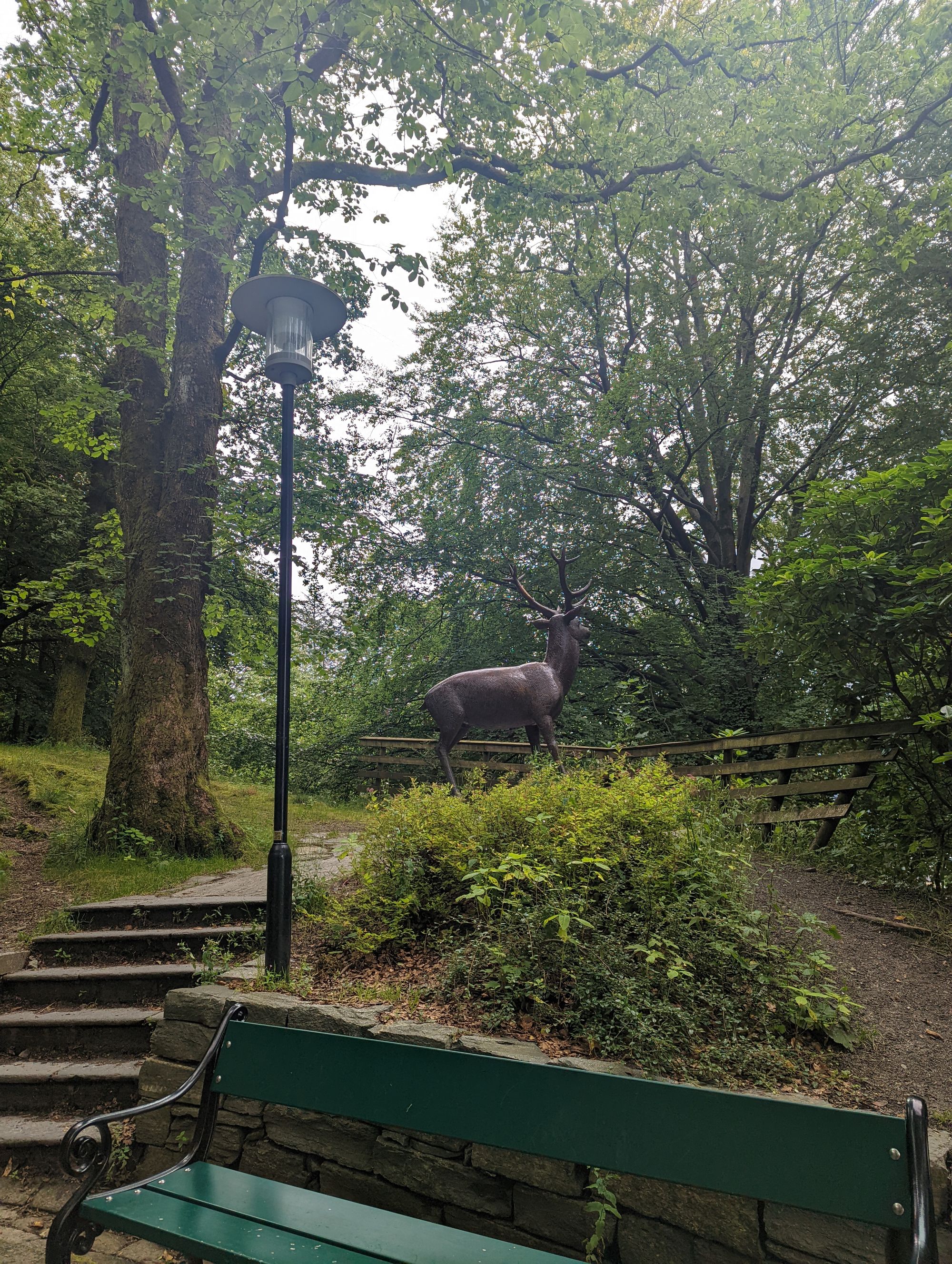 Am Rückweg bekam ich vom Michael (Oberösterreicher) eine Einladung fürs wandern, die ich dankend annahm. Wir gingen rauf zu den Fløyen. Am Weg hinauf sah ich eine Statue von einem Wild. Die würde der Moritz sicher gerne mitnehmen!