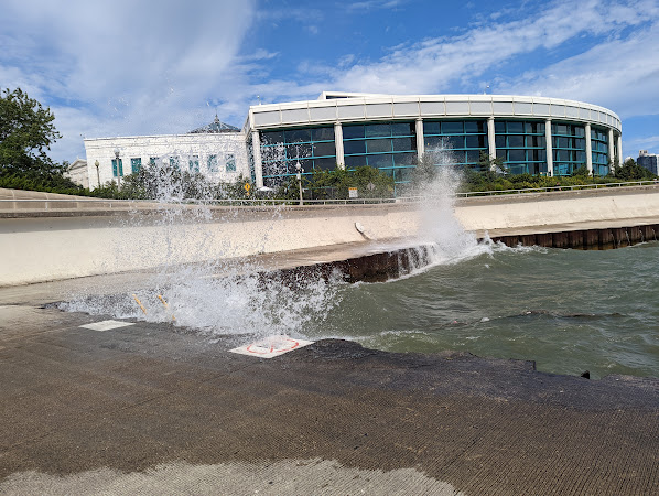 Der Wind hatte starken Wellengang ausgelöst und der Weg, wo ich üblicherweise entlang spazierte, war einfach überflutet. Da ich neugierig war, ging ich diesen Weg vor bis zum Adler Planetarium und dort wurde es sogar noch schlimmer, am unterhaltsamsten war es mitzubekommen, wie die Amis sich plötzlich wunderten woher die Wellen kamen.