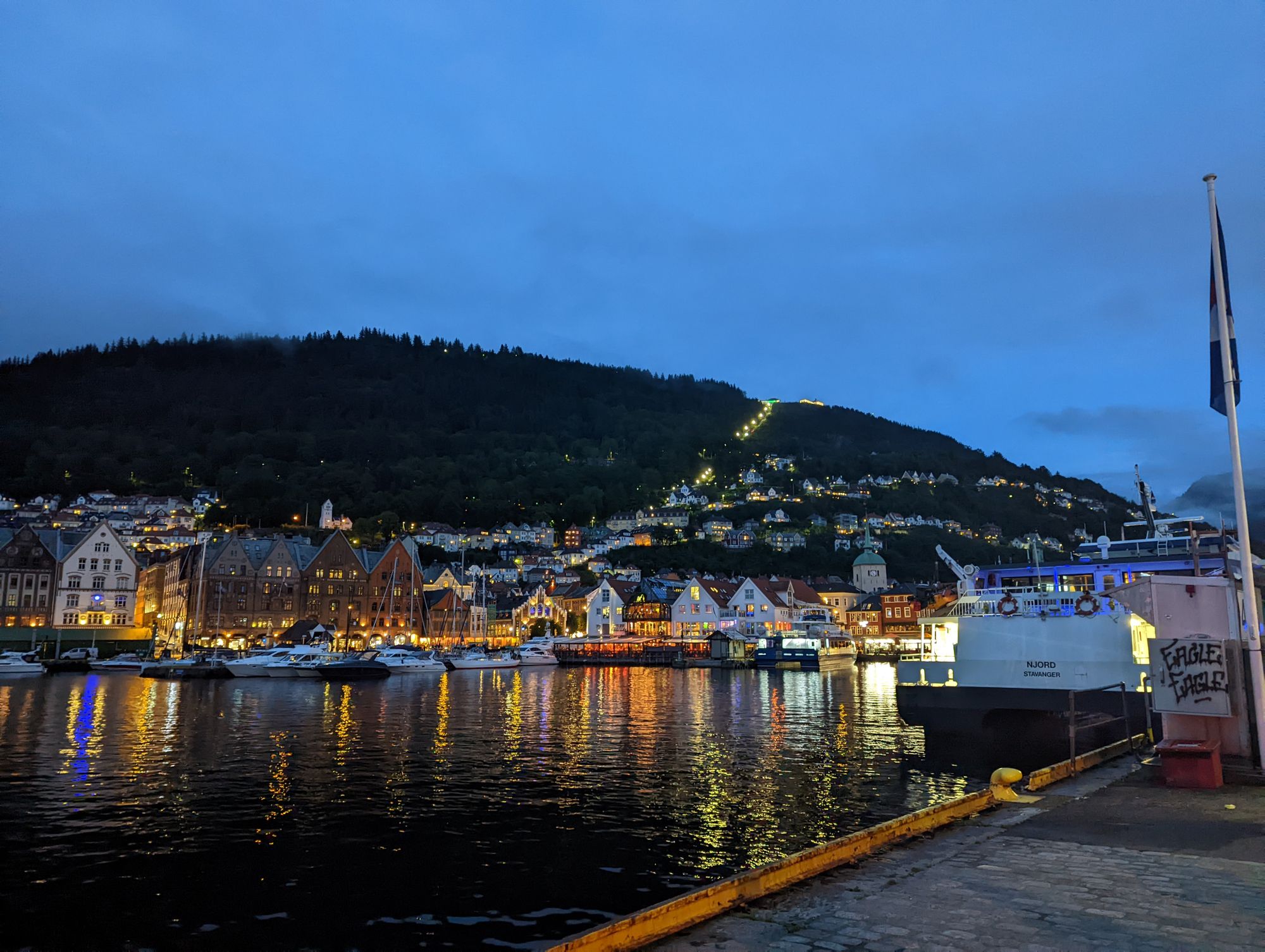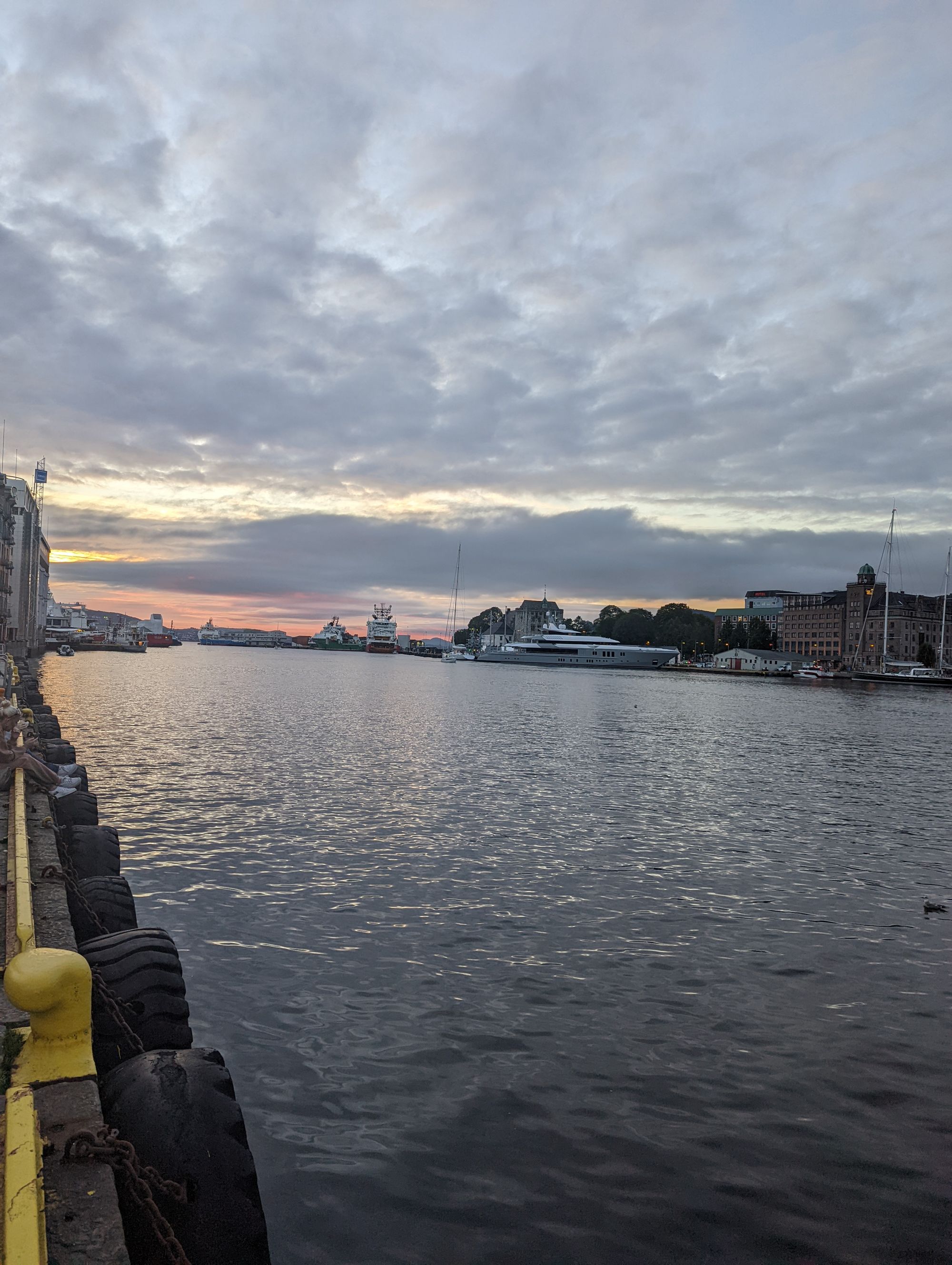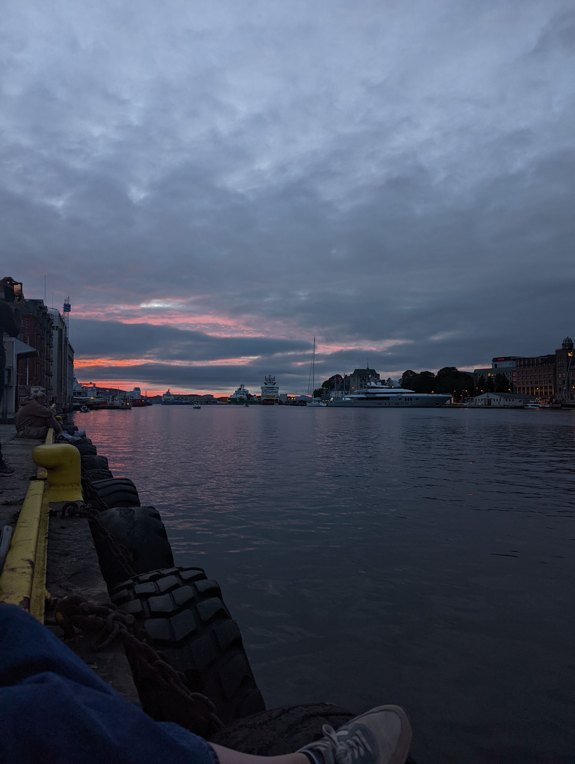 Da uns langweilig war, entschieden wir uns raus den Sonnenuntergang auf den Fløyen anzusehen. Leider waren einige von der Gruppe nicht so sportlich und lehnten diesen Vorschlag ab. Somit setzten wir uns zum Hafen, um den Sonnenuntergang zu genießen.
