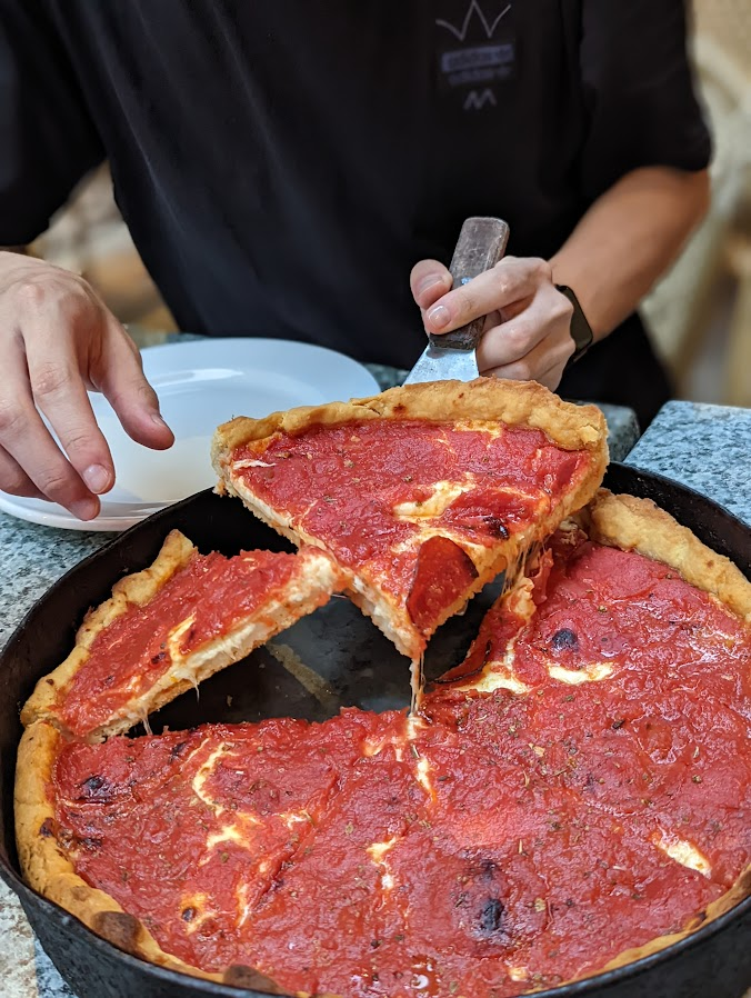 Zurück in Downtown suchten wir dann eine Deep Dish Pizza (keine Ahnung warum die unbedingt eine probieren wollten), aber ich kam mit und wir bestellten eine Medium Pizza, welche offiziell 3 Portionen groß ist. Lassts wirklich die Finger von der, die ist recht grauslich, harter Teig wie ein Kuchen, dann alles mit einer gefühlt Zentimeter dicken Schicht an Käse und dann ein Belag, der Preis für die ganze Pizza war 29$, natürlich vor dem Trinkgeld.