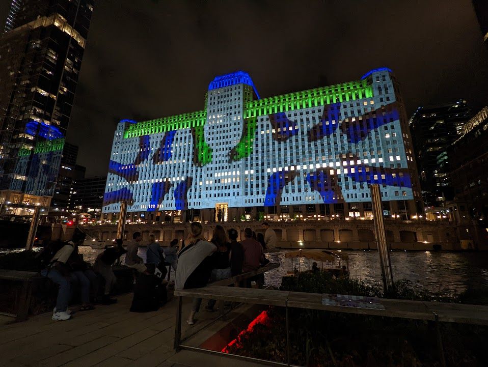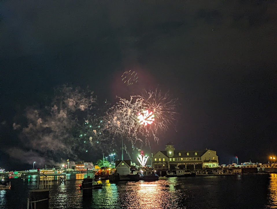 Nachdem wir die Pizza gegessen hatten, machten wir uns auf den Weg zur Lichtshow "Art on the Mart", wir warteten 40min, weil wir etwas zu früh waren, aber die Haxn von den anderen beiden waren eh schon sehr erschöpft. Die Lichtshow, bei der das alte Marktgebäude angeleuchtet wird und auch die Vorstellung vertont wird, war nicht so toll wie gedacht. Das erste war irgendwie noch halbwegs okay, da ging es um ein Musikstück was am Gebäude gespielt wurde, aber die zweite Show verstand keiner von uns. Da um 10 Uhr ein Feuerwerk am Pier wartete, beeilten wir uns dorthin zu kommen und es ging sich aus. Die netten Amerikaner schießen ja 2x die Woche rund 10 Minuten lang ein Feuerwerk in die Luft - Umweltverschmutzung existiert anscheinend noch nicht.