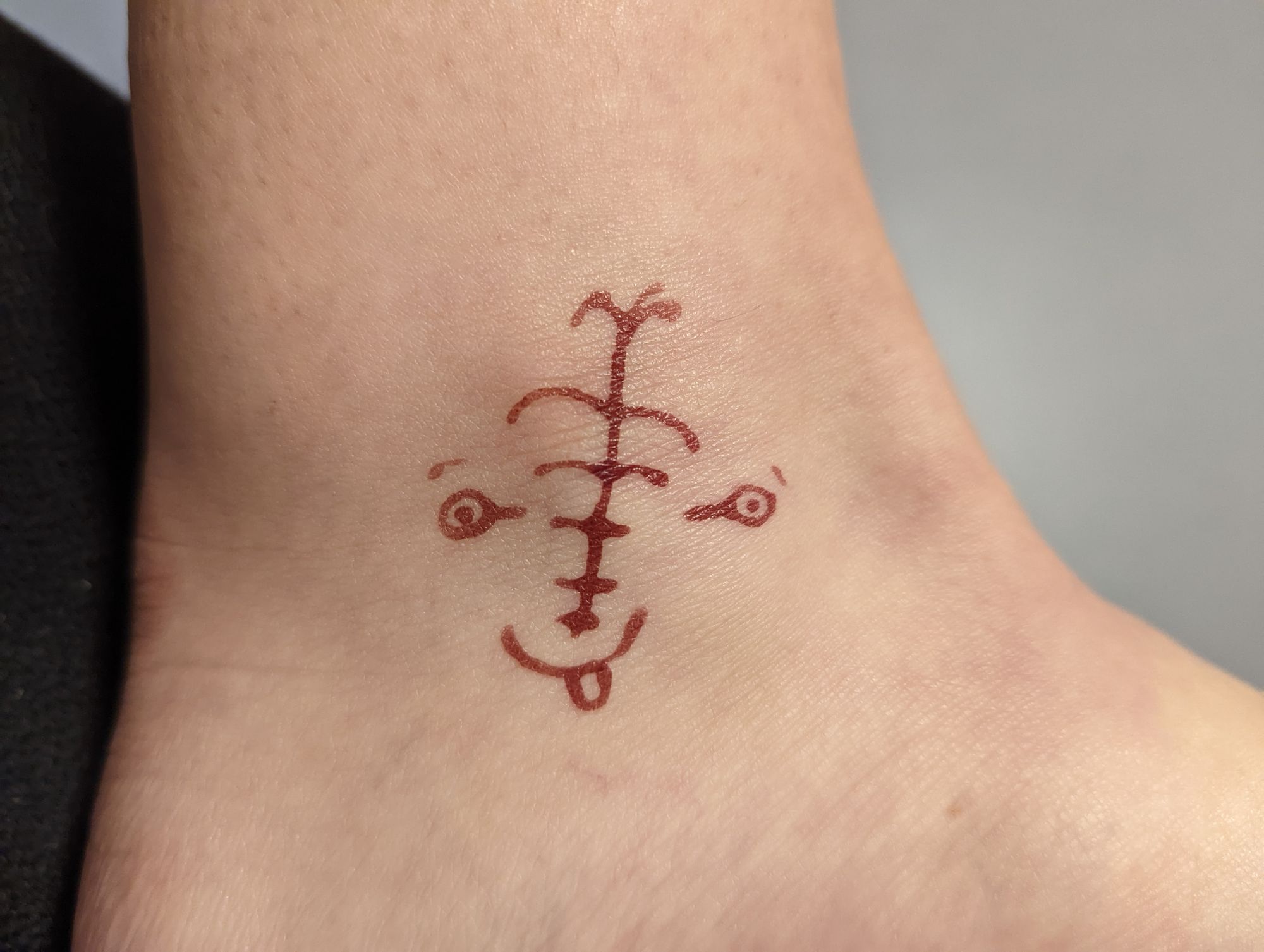 Er hat einfach frei nach Gedanken herum gemalt und plötzlich sah es irgendwie wie ein Gesicht aus. Deswegen bekam es noch einen Mund, eine Zunge und Augenbrauen. Ob es mir gefällt? Naja, es war aber trotzdem eine lustige Idee. Zum Glück geht es ja nach der Zeit wieder weg. Ob ich mir selbst eine Henna Farbe kaufen würde? Vielleicht, wenn sich ergeben würde, ja, da es eine coole kurzweilige Erinnerung ist, auch wenn ich mich jedes Mal aufs neue über dieses Tattoo erschrecke :D
