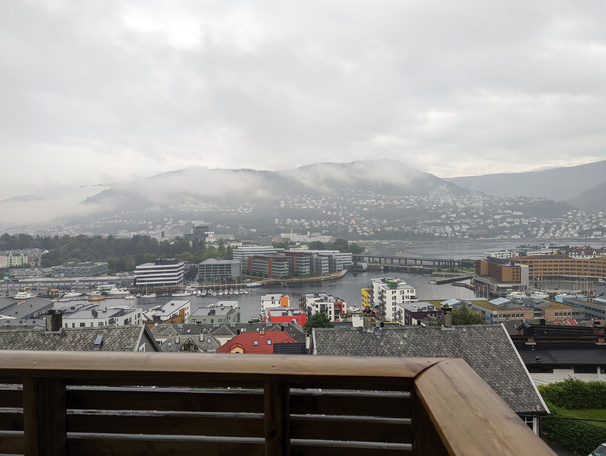 Am nächsten Tag ging ich gleich einmal in der Früh die restlichen Zutaten für mein Curry einkaufen. Da ich ja endlich Lunchboxen hatte, konnte ich mir gleich ein wenig für die nächsten Tage vorkochen. Nachdem ich alles gekauft habe, hab ich mich recht schnell daran gesetzt alles vor zu bereiten. Außerdem habe ich auch das erste Mal Wäsche in Bergen gewaschen. Pro Waschgang zahl ich mit all inklusive € 2,59. Einerseits recht viel, aber dafür muss ich mich nicht um das Waschmittel oder Wasser kümmern. Eigentlich war für den Nachmittag wieder ein Spiel von der Welcome Week angesagt. Leider hatte es so stak geregnet, dass meine Gruppe dies fallen lies. Aus diesem Grund gingen wir gleich zur ca selben Zeit zur einer anderen Houseparty. Das war die Aussicht vom Balkon: