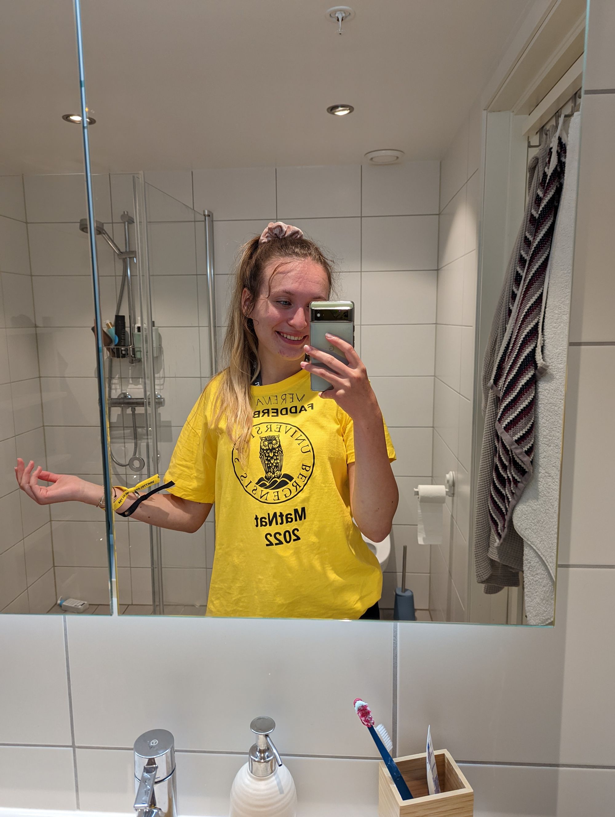 Am Abend gingen wir nochmals auf eine Houseparty von Norwegern, wo wir Spiele wie Reise nach Jerusalem, Limbo und so weiter gespielt hatten. Wieder mit unseren gelben T-Shirts. Zum Glück hält die Beschriftung „Verena“ recht gut nach dem Waschen! Hier noch ein Selfie, wie ich es einfach witzig finde, dass wir bei eher Fremden in der Wohnung sind.