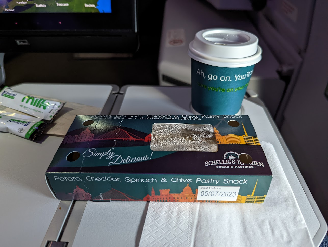 Über kanadischem Festland gabs dann noch einen kleinen Tee (nicht nachrechnen wieviel ich an dem Tag getrunken habe bitte) und eine Tasche, auch wieder halbherzig aufgewärmt. Der Tee war ohne die Milch kaum zu trinken, dabei sollten doch die Iren durch ihre Nähe zu GB eine Ahnung von deren Nationalgetränk haben, wobei wir ja auch nicht die Tunke am Schnitzel verstehen.